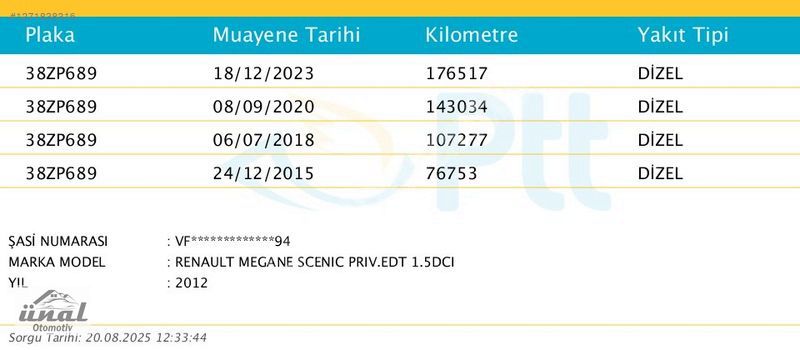 TÜM BAKIMLARI PERİYODİK OLARAK (15 - 20 - 30 - 40 - 50 - 62 - 80 (Trigerli Ağır Bakım) - 90 - 95 (EDC'nin Ağır Bakımı) - 110 - 130 - 140 (Trigerli Ağır Bakım) - 150 - 165) SADECE YETKİLİ SERVİSTE (Renault - MAİS) YAPILMIŞTIR, KALAN (175 - 185 - 190) BAKIMLARI DA ÖZEL SERVİSTE YAPILMIŞTIR, TÜM KAYITLARI MEVCUTTUR