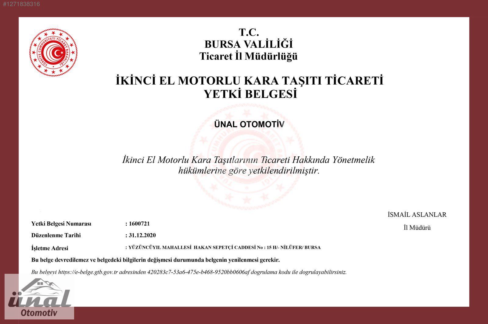 FİRMAMIZ 160721 NUMARALI "İKİNCİ EL MOTORLU KARA TAŞITI TİCARETİ YETKİ BELGESİNE" SAHİPTİR