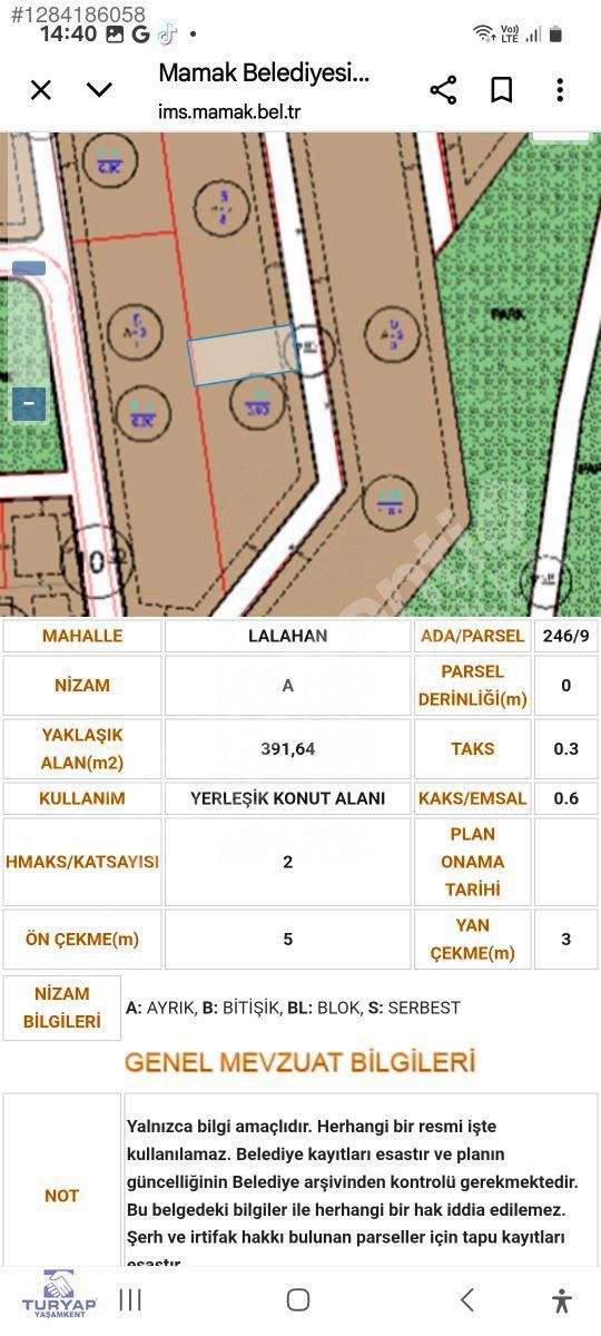 246 ADA 9 PARSEL TAKS 0.30 KAKS/EMSAL 0.60 YÜKSEKLİK: 2 KAT