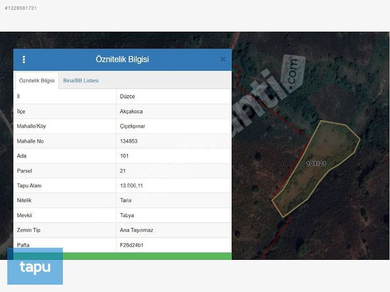 Özellikler: Düzce İli, Akçakoca İlçesi, Çiçekpınar Mahallesi, Tabya mevkii, 101 Ada 21 Parsel, 13.806,11 m² yüzölçümlü tarla vasıflı taşınmazdır. 101 ada 21 parsel tarla vasfında olup, 13.806,11 m² alanlıdır. Geometrik olarak amorf bir şekle sahiptir. Parsel yaklaşık olarak %10 eğimli topografyada olup kadastral yola cephesi bulunmamaktadır. Uzaktan yapılan tespitlerde parsel üzerinin doğal bitki örtüsü ile kaplı olduğu anlaşılmıştır.