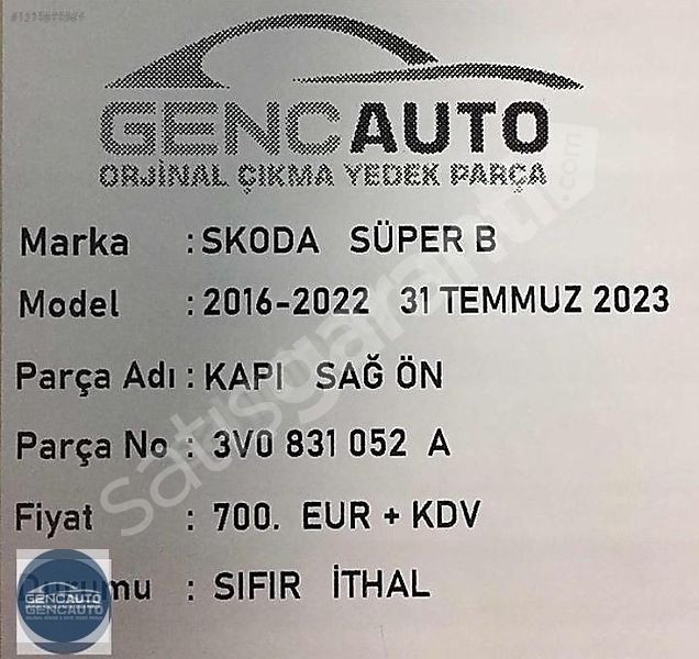 SKODA SÜPER B SAĞ ÖN KAPI SIFIR İTHAL OEM 3V0831052 A