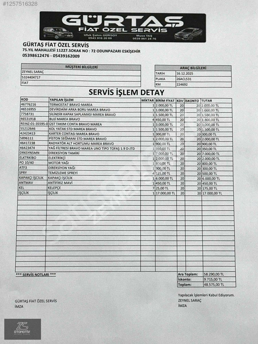 ÜSTTEKİ YAPILANLARA EK ARACA FİAT GÜRTAŞ ÖZEL SERVİSTE YENİ KOMPLE BAKIM YAPILDI. (50.000₺) (17.12.2025)