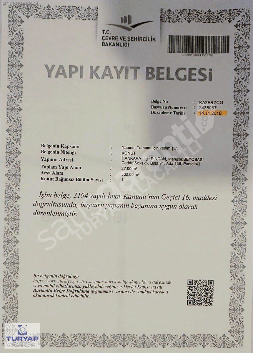 YAPI KAYIT BELGESİ ALINMIŞ