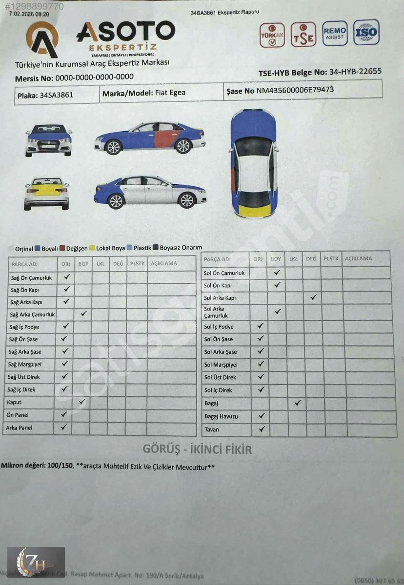EXPERTİZ BİLGİLERİ = ARACIMIZDA 1PARÇA DEĞİŞEN